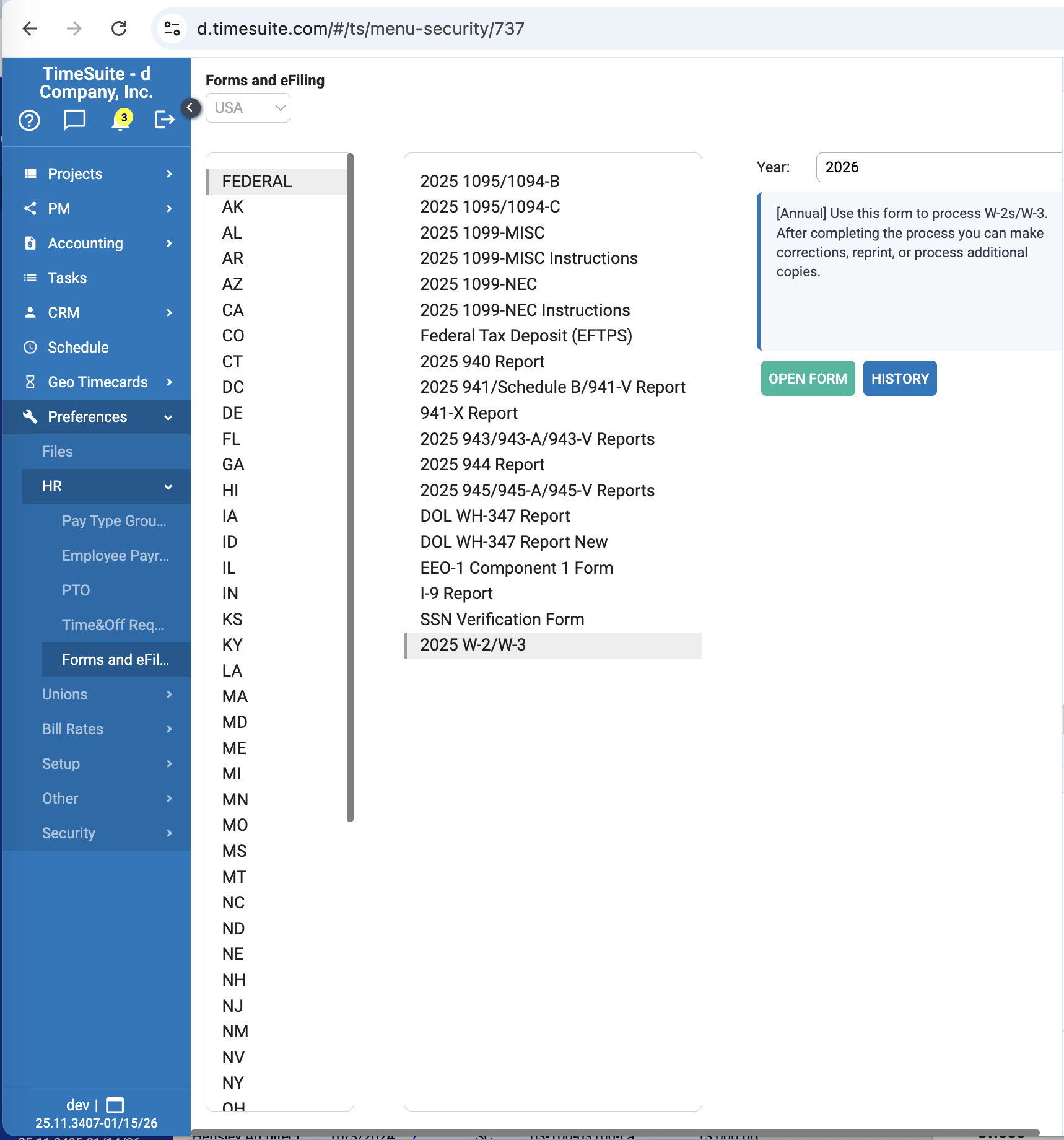 | Aatrix eFile's payroll tax reports can be found under the "Preferences" tab of your TimeSuite software, followed by clicking on the "HR" tab and finally selecting "Forms and eFile" from the left-hand menu.